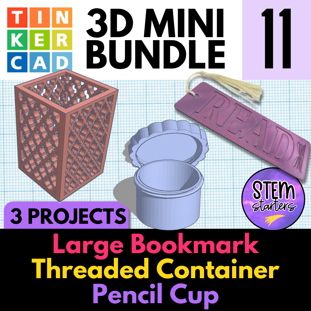 Looking for quick, engaging, and classroom-ready 3D printing projects that teach CAD design skills with real-world applications? This Tinkercad Mini Bundle includes three beginner-friendly 3D design lessons: Threaded Container, Large Bookmark, and Designer Pencil Cup—perfect for upper elementary and middle school students!